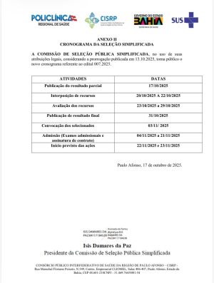 A Comissão de Seleção Pública Simplificada do Consórcio Público Interfederativo de Saúde da Região de Paulo Afonso (CISRP) divulgou um novo cronograma referente ao Edital nº 007/2025, conforme prorrogação publicada em 13 de outubro de 2025.