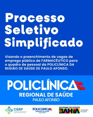 Contratação temporária de Farmacêutico para atuação na Policlínica Regional de Saúde de Paulo Afonso, com formação de cadastro de reserva.