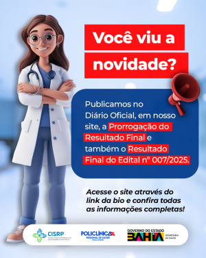 O Consórcio Público Interfederativo de Saúde da Região de Paulo Afonso (CISRP) informa que foram publicadas no Diário Oficial e também em nosso site a Prorrogação do Resultado Final e o Resultado Final do Edital nº 007/2025.